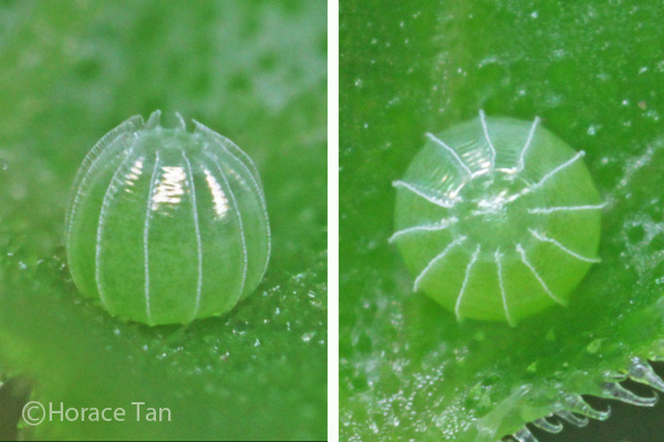 The eggs of the Blue Pansy are laid singly on the young leaves or shoots of the host plant or other plants in the vicinity. The greenish egg is somewhat globular in shape but with a blunt top. Twelve raised ridges run from this top end to the base of the egg. Each egg has a diameter of about 0.6-0.7mm.