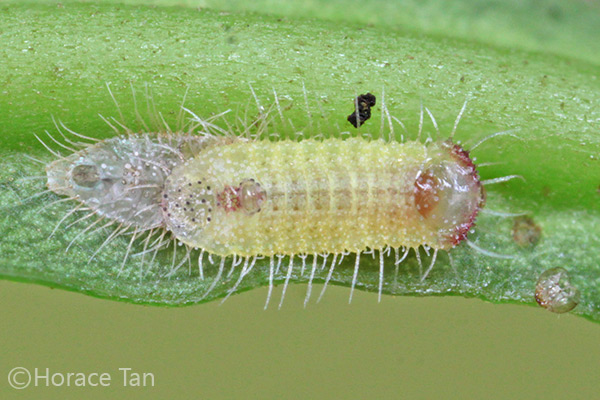The 2nd instar caterpillar features long lateral setae and a black head. Long dorso-lateral setae are no longer present, but many short setae appear on the entire body surface. The prothorax is marked by a large black patch with a leading edge in pinky red. The dorsal nectary organ (DNO), ringed in dark reddish brown, is already visible on the 7th abdominal segment. It is flanked on its upper edge by a small dark reddish patch, and on its lower edge, a much larger one which covers the dorsum of the 8th abdominal segment. The pair of tentacular organs on the 8th abdominal segments are also present. A large black anal plate dominates the remaining posterior segments. This instar lasts for 3-4 days with the body length reaching about 4mm before the moult to the 3rd instar.