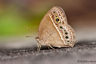 Burmese Bush Brown caterpillars in the act of catapulting frass pellets. The next moult brings the caterpillar to its 5th and final instar. Now the caterpillar could appear in two colour forms: a brown form which is mostly pale to dark beige brown and a green form which is pale yellowish green. Feature wise, there is now a narrow band on the dorsum of the thorax. In addition, small black dorso-lateral spots appear at the joints between segments 2 to 7. Furthermore, faint oblique stripes adorns the body surface. In a period of 8 days, the body grows to a maximum length of about 32-35mm. Two views of a newly moulted 5th instar caterpillar, length: 20mm. Two views of a 5th instar caterpillar, green form, length: 29mm. Two views of a 5th instar caterpillar, brown form, length: 35mm. Two views of a 5th instar caterpillar, late in this stage, body shortened and body colour changed to mostly green, length: 22mm. Toward the end of the 5th instar, the body gradually shrinks in length and the body of both colour forms turn mostly green. Finally the caterpillar finds a spot on the underside of a leaf blade to spin a silk pad. It then secures itself there via its anal end, and assumes its upside-down pre-pupatory pose. A prep-pupa of Burmese Bush Brown. After one day as a pre-pupa, pupation takes place. The smooth pupa is mostly green throughout. It is somewhat angular in appearance, with a dorsal keel on the thorax and ridges defining the dorsal wing margins. There are a few small black spots dotting the wing pad margin. Dorso-lateral pairs of small yellowish spots can be observed on abdominal segments 2-6. Length of pupae: 15-16mm. A Burmese Bush Brown caterpillar moults to its pupal stage. Three views of a pupa of Burmese Bush Brown. After 5 days of development, the pupa becomes darkened in color, and the ringed-spot on the forewings can now be seen through the pupal skin in the wing pads. The next day the eclosion event takes place with the adult butterfly emerges to start the next phase of its life cycle. Three views of a mature pupa of Burmese Bush Brown. A Burmese Bush Brown caterpillar emerges from its pupal case. A newly eclosed Burmese Bush Brown. References: