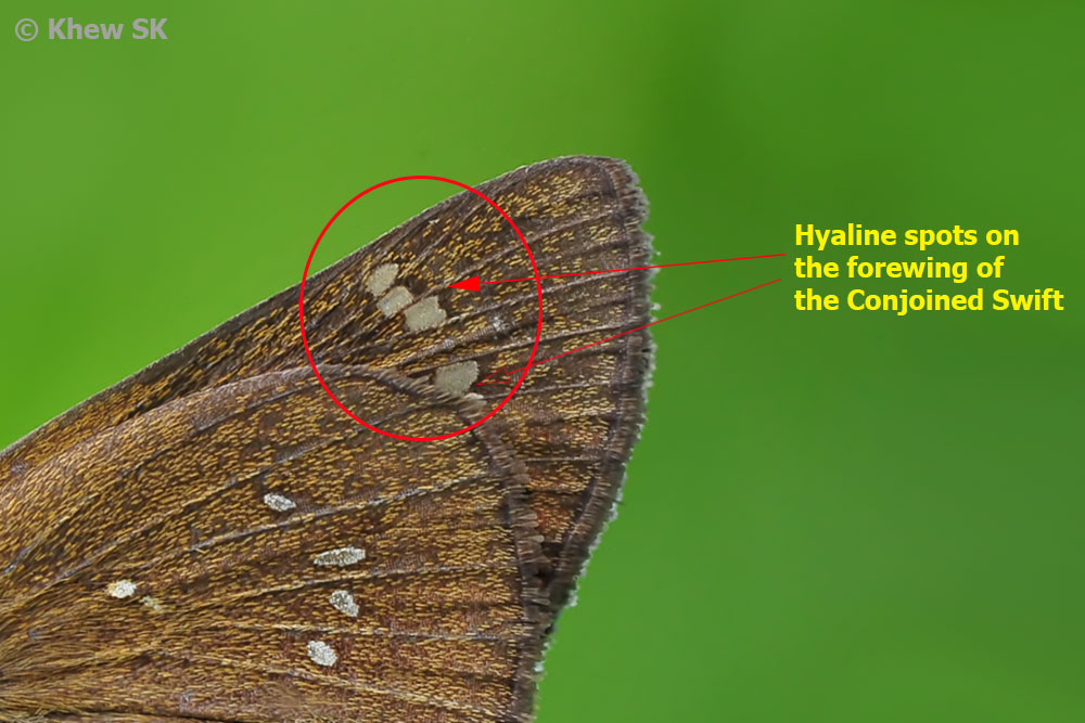 An example of a skipper's description is the Conjoined Swift (Pelopidas conjunctus conjunctus) which features "pale yellowish-white hyaline spots in spaces 2-4, 6-8 and two cell spots in the forewing."