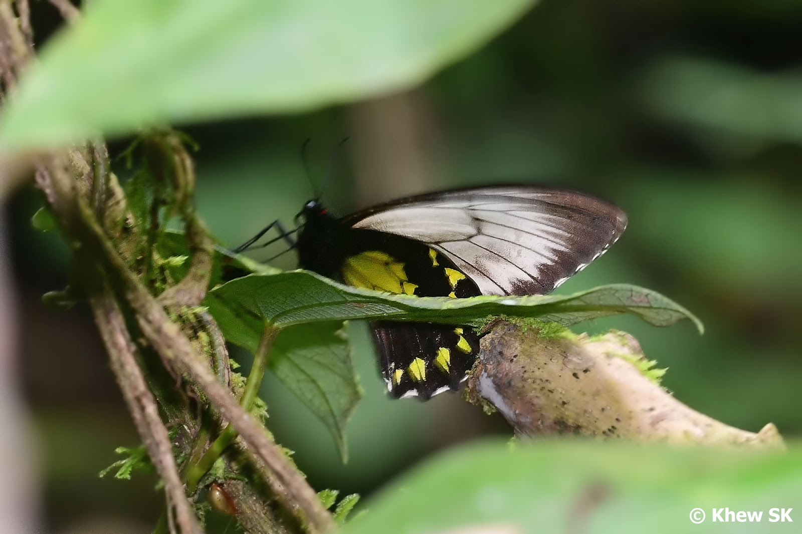 As the sun rose and many areas in the forest understorey began to be illuminated by the warm sunshine, more butterflies stirred. A lone female endemic Troides andromache andromache fluttered across the stream and kept returning to a particular tree. Although it did not stop for a good shot, it fluttered higher up and suddenly adopted the usual ovipositing pose. It was then I realised that I was just standing next to its caterpillar host plant, an Aristolochia vine. It was just awesome to watch this magnificently large Birdwing that can be found only in Borneo.