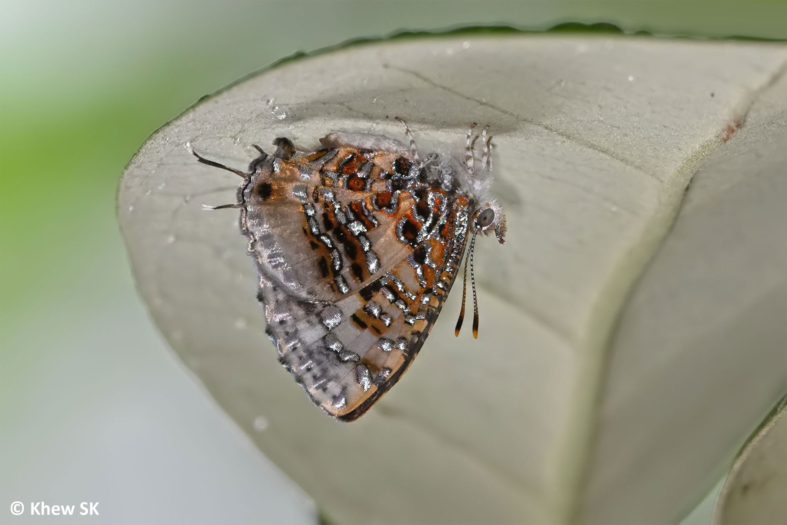 A Grey Tinsel resting on the underside of a leaf of Api-api bulu.